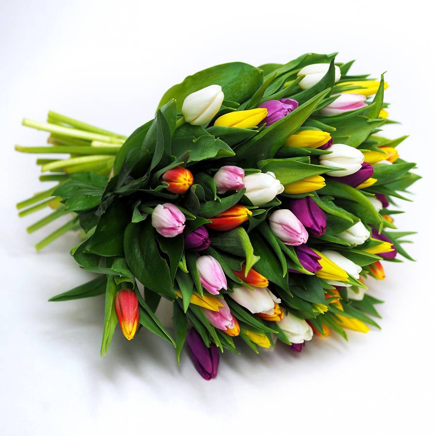 Традиционный весенний цветок с богатой палитрой оттенков: белый, жёлтый, красный, оранжевый, фиолетовый, чёрный, многоцветный — нежные бутоны вобрали в себя всё великолепие цвета. Существует поверье, согласно которому следует дарить только нераскрывшиеся тюльпаны, так как именно в молодом бутоне спрятано счастье. Как только цветок распустится, это счастье войдёт в жизнь получателя.
